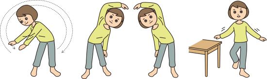 高齢者の下肢の運動(筋トレ)としては、日本整形外科学会が推奨しているロコトレという運動が安全で効果的です。このほか、全身の運動に加えバランス機能も鍛えられる運動として、ラジオ体操は大変有効です。当院では、ご高齢でめまいのある方には、このロコトレとラジオ体操を、お勧めしています。
